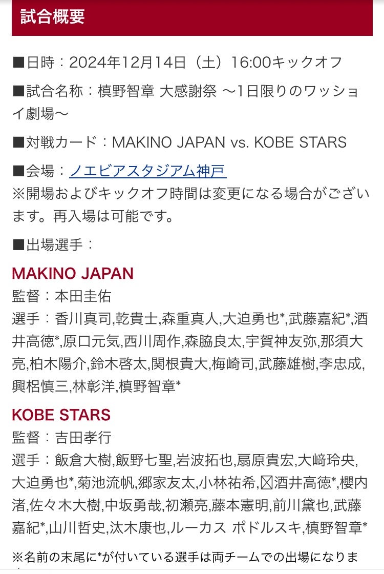 @ultrasoccer🇯🇵メンバー発表 槙野智章の引退試合の出場選手が発表! 「MAKINO JAPAN」の監督は本田圭佑、「KOBE STARS」にはポドルスキの名前も! 🔗web.ultra-soccer.jp/news/view?news… #visselkobe #daihyo ✅#槙野智章 氏の引退試合メンバーが発表。#本田圭佑 が監督、今季限りで引退の #ルーカス・ポドルスキ も参加予定