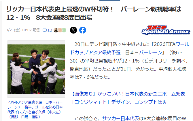 @underst32541969思ってたより高かった👏 サッカー日本代表史上最速のW杯切符! バーレーン戦視聴率は21・7% 8大会連続8度目出場(スポニチアネックス) #Yahooニュース news.yahoo.co.jp/articles/a7942…