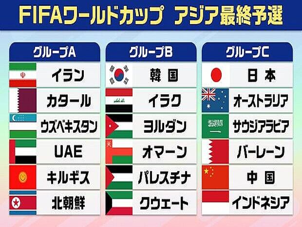 6月27日、2026年北中米ワールドカップ・アジア最終予選の組み合わせ抽選会がマレーシアのクアラルンプールで行なわれ、以下のように組分けが決定した。